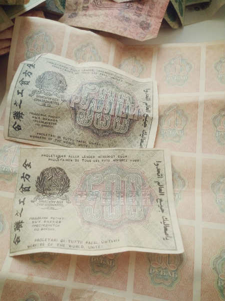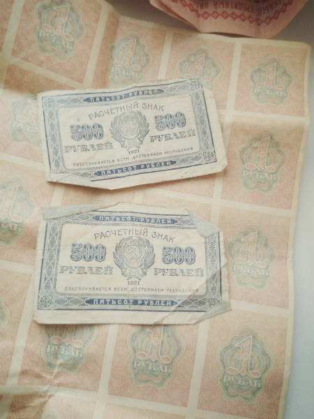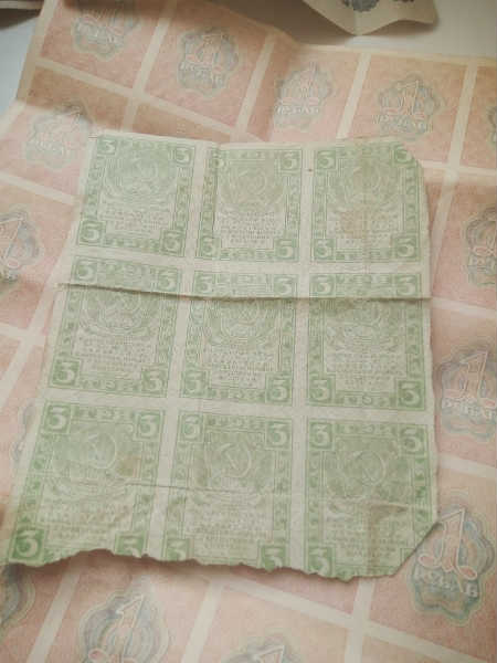 самая "ценная" из всей кучи неразрезанный лист рублей 19 года ( рубля два должна бы стоить, если не рвань и нет грязи с обратной стороны), , на втором месте 15 рублей 19 года ( почему-то за ней больше всего гоняются, хотя банальщина в таком сохране, рублей 500 стоит.., замыкает сей "клад ""по ценности" набор пятаковщины 18 года от маленьких номиналов к большим, стоимость которых стремится к нулю в таком состоянии