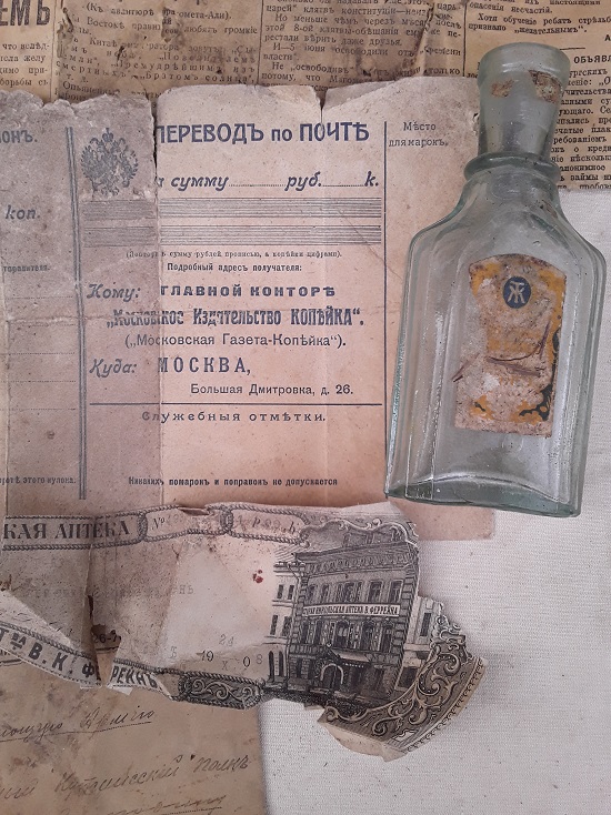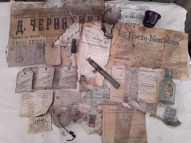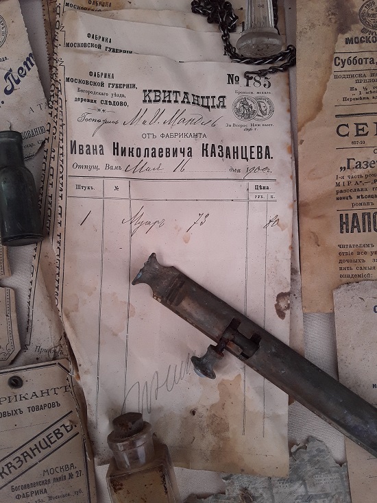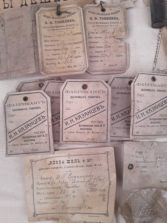 Им оказался фабрикант шёлковых товаров Иван Николаевич Казанцев. Разговор с местной жительницей подтвердил это. Сказано было, что в доме жили богачи-фабриканты. Были найдены и другие ярлыки, от тех кто поставлял Казанцеву шёлк-сырец, а также квитанции, кому отправлялась готовая продукция. Интересен конверт в Действующую армию, в 158 пехотный Кутаисский полк, видимо сыну фабриканта.