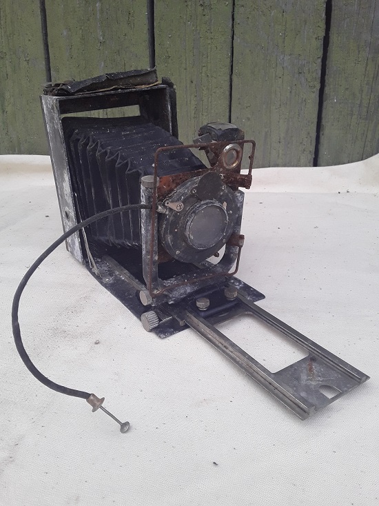 На чердаке был также найден довоенный фотоаппарат "Фотокор № 1", производившийся до войны в Ленинграде. И добавлю ещё фото сумки, найденной в другом доме. Всё-таки, это поисковое краеведение преподносит иногда сюрпризы! Сумка оказалась не простой, а сухарной сумкой британской армии, образца 1908 года, третьего типа, поставлявшейся англичанами белым во время Гражданской войны. Сумка сохранилась неплохо, брезент и медь - вещи долговечные Вложенные эскизы изображений |