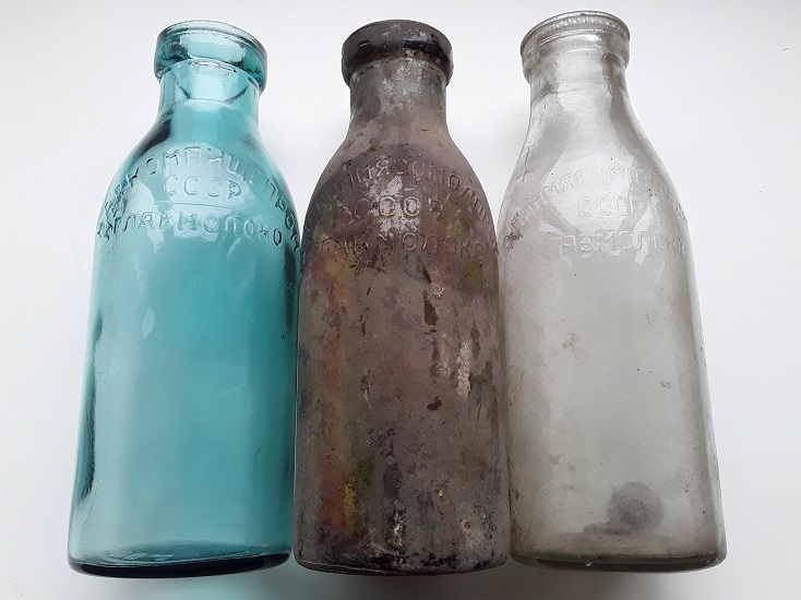 Высыпал труху из ведра и вместе с ней выскочил ещё и двугривенный. Нашёл ещё молочную бутылку с надписью "Наркоммясомолпром СССР". Теперь у меня уже 3 молочных бутылки и все с разными надписями. На фото они в порядке старшинства. Слева бутылка 1938 года, в середине 1939-1946 и справа 1955 года.