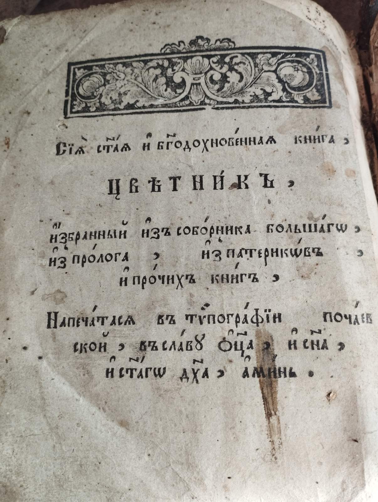 судя по фото,что вы хаотично выложили : Цвѣтникъ, избранный изъ Большого соборника, изъ Прологовъ, изъ Патериковъ и изъ прочихъ книгъ напечатася въ тѵпографіи Почаевской– на самом деле нелегально - Клинцы: Типография Карташевых, после 1813г,многократно переиздаваемый,с незначительными нюансами,чтобы точно определить дату книги нужно видеть...Большое количество цветников , в выходных данных которых значится Почаев, напечатаны же они были в Клинцовской или Яновской типо-графствах,в 1907г вышла копия данного цветника в типографии при Троицко Введенской церкви Москва