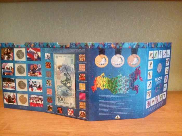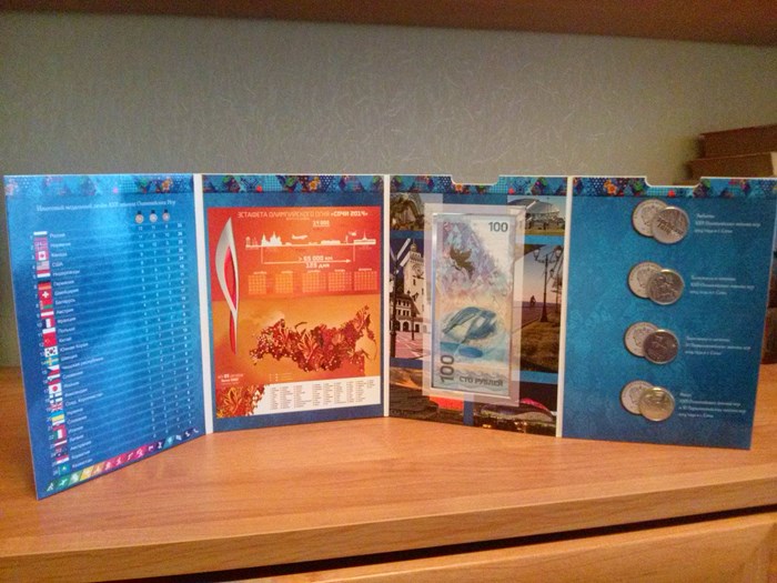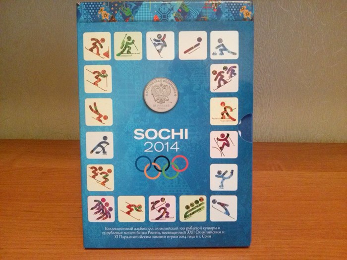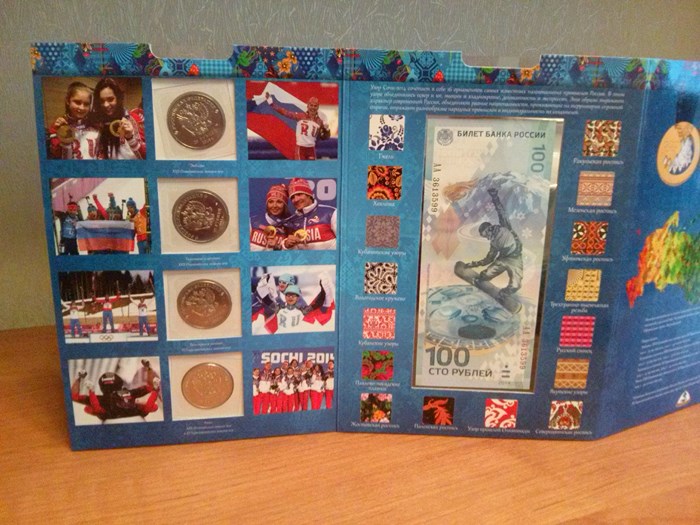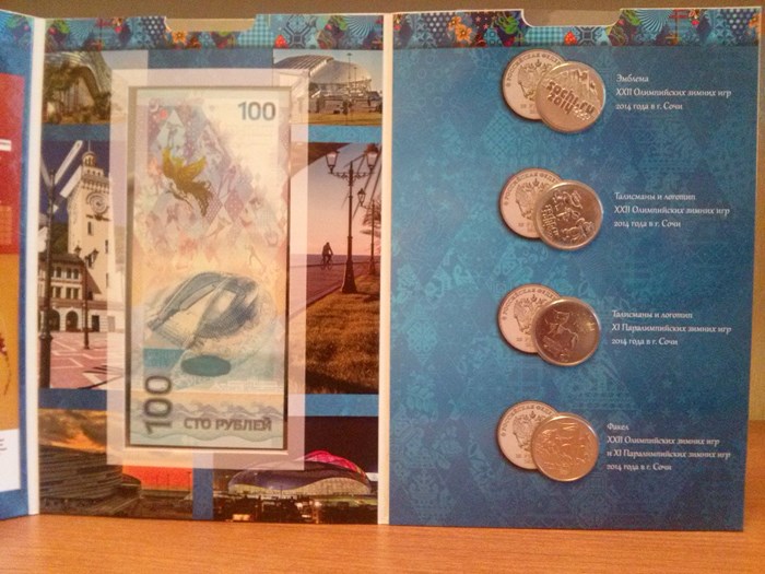4 разные монеты 25руб.Сочи 2014г.+100руб.банкнота Сочи+альбом-планшетка, стоимость 1шт. 750руб.+пересыл 80руб.