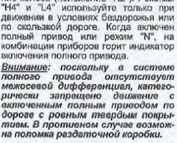 QUOTE(Кладухунашел @ Sep 24 2016, 11:57) Что за бред,на Хае можно на полном ездить,зимой все ездят.А на счет салона,ездил и на том и на том,в хае мне все равно больше нравится,по размеру примерно одинаковы.И на счет "подметки",я бы сказал с точностью наоборот. Ну почему же бред, вот например рекомендации из инструкции по эксплуатации автомобиля (см. ниже). А если машина используется где-нибудь в Москве или в ближайшем Подмосковье, то о включении полного привода зимой я бы десять раз подумал. Для наших дорог трансмиссия L200 (которая с super select) всё же лучше приспособлена. При этом считаю не лишним упомянуть о цене, L200 с super select будет стоить не дороже обычного part-time Hilux. Про проходимость: В стоке, если говорить о машинах за 2 млн. руб. (начальная цена за Hilux) последней модификации, L200 будет выигрывать как минимум из-за дополнительного межосевого дифференциала - простая теория. Кто-то конечно будет спорить, но это лично моё мнение. И давайте не будем поднимать тему про электронные блокировки Hilux или больший клиренс, чем у L200, а так же топовый двигатель в 2.8 литра Если говорить о внедорожном тюнинге, то у L200 в арках больше места, я конечно рулеткой не замерял, но визуально лично мне это видно. Обвес и т.п. доступней и разнообразней именно на L200. Вот такая ещё у меня мысль в голове крутится. L200 просто шепчет, чтобы её окунули в грязь, а Hilux грязи не боится, но замараться не хочет (жалко). Мнение субъективное конечно, но у меня сложилось именно такое. Про салон, комфорт и т.п.: Тут каждый выбирает под свою попу и глаз, кошелёк в конце концов. Вложенные эскизы изображений -------------------- Oct12 2018
