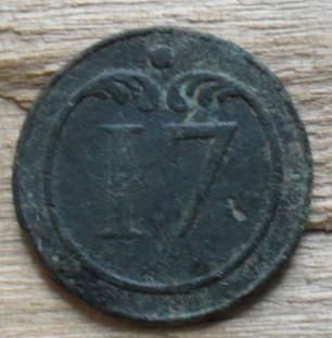 Пуговица 17 линейного полка ВА Наполеона 1 на период войны 1812 года. Достаточно частая, ввиду своего состояния цена к 0