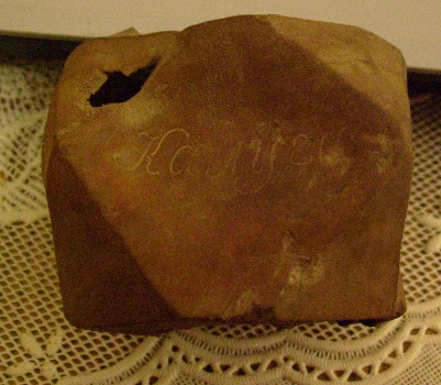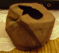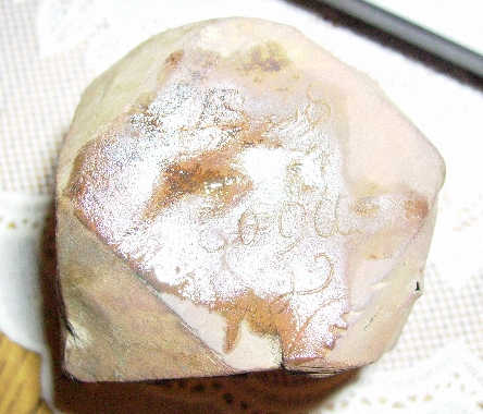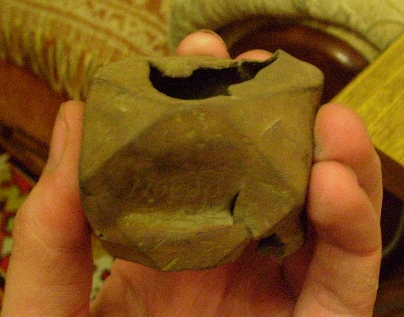 Сегодня на одном урочище в центре бывшей деревеньки на месте домов нашёл такой предмет сложной правильной тригонометрической формы: "куб со сточенными углами", медь, внутри полый, внутри полости неправильной формы оловянно-свинцовый кусок неправильной формы, внутри которого вроде даже что-то железное есть. На верхней и нихней гранях отверстия - грубые неправильной формы, даже "рваные". На боковых гранях надписи каллиграфическим почерком выцарапаны умело: