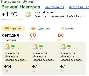 QUOTE(zax @ Apr 15 2010, 12:46) На выходных стоит захватить теплую одежду, кто собирается в дальний путь Синоптики обещают похолодание: А тут уже потругому. http://pogoda.yandex.ru/26179/details/ |
