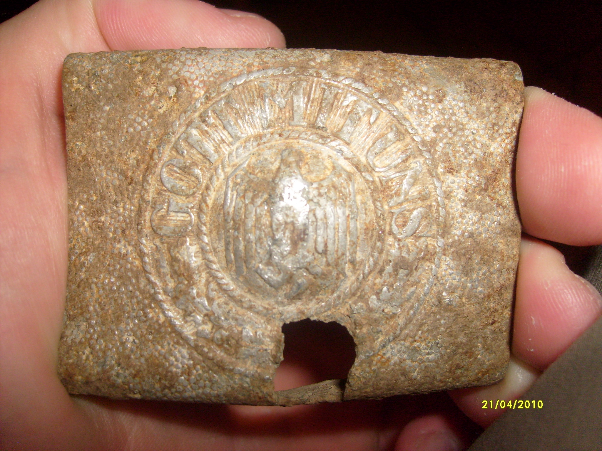 QUOTE(-=Demon=- @ Apr 27 2010, 22:15) хочу поделиться фото сегодняшней нежданной находки с поозерья...если есть ценители военной тематики, ждем комментариев.... Пряжка нижних чинов Вермахта, алюминий, в полевых условиях окрашена в цвет feldgrau то есть защитный.От лежания в земле часто появляется очаговая коррозия. Не реткая встречается довольно часто на боевых позициях. |
