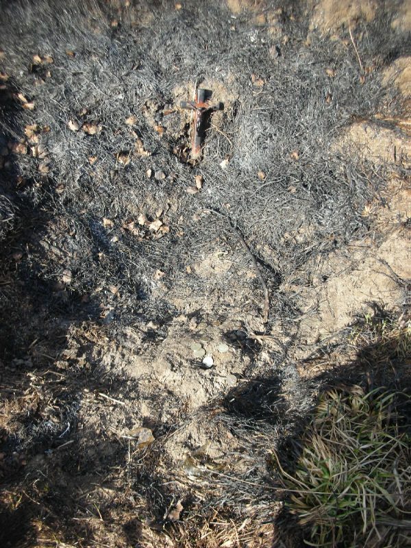 Под конец копа сменили место, и почти сразу первым сигналом выскочила залипуха чешуи, ну всё, думаю, сейчас точно попрёт… И вдоль ходил, и поперёк - тишина. Походу просто оплавок, непонятно только как, что, всего четыре монетки были в кошельке? (который как я понимаю упал, трава потом горела). Вот так вот, за коп два раза думал что клад нашёл