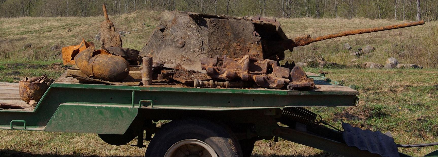 В самой деревеньке тоже обнаружились следы следопытов. В одном я комков я достал 3 копейки 49 г. - очевидно следопытов монеты не интересовали либо они ее пропустили. На обратном пути сфоткали прицеп с железом поисковиков: несколько мешков с костями, шлемы и башню от танка (???). Вложенные эскизы изображений -------------------- Поле, русское поле Светит луна или падает снег