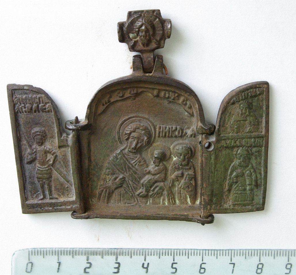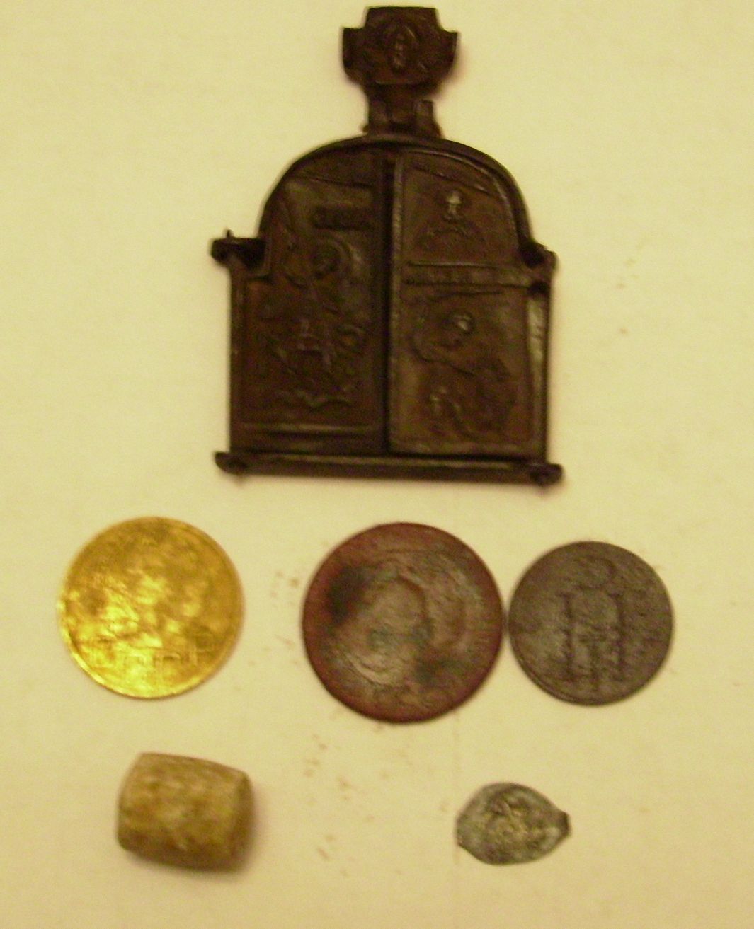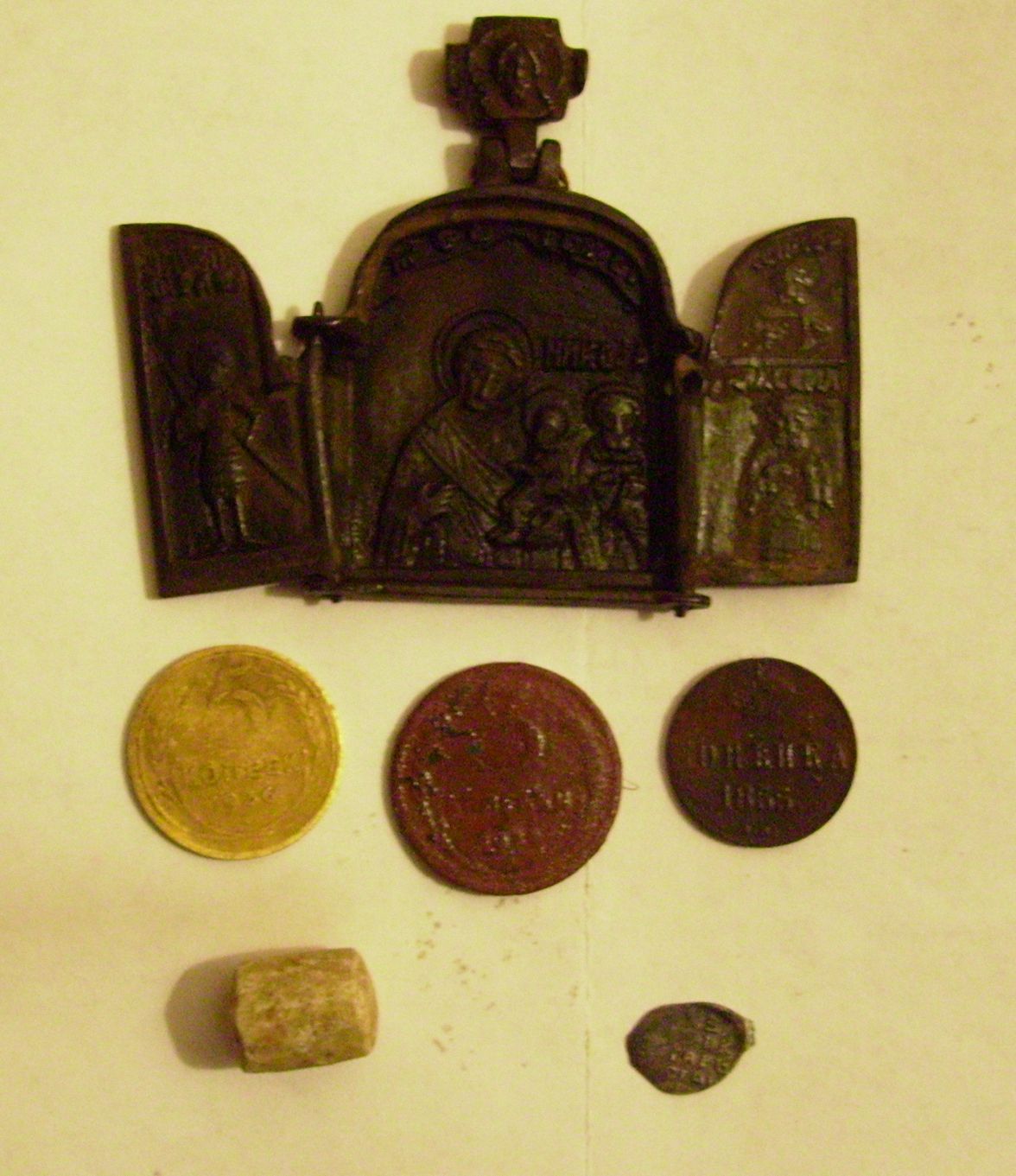 Первые полчаса у меня не перло - поэтому взял первую монету копа этого дня у Runden, потеребил... поколдовал... и пошел... Первым вышел складень-триптих в отличном сохране из бронзы с самыми крутыми святыми того времени (в т.ч. Св.Егорий (Георгий), Никита-бесогон, Св. Николай уг.). Недалеко от триптиха были найдены хороший пятак 1936 года и трояк 1924 года страшный. После недолгого марша в районе кабака у меня была найдена тольки копейка 1855 года и непонятная гильза. На обратном пути зашли с друго й стороный дороги. Уже подустав от бытового и военного мусора я на 28 выкопал чешую. Выкладываю пару фоток и продолжаю болеть за наших! Сообщение отредактировано zax: May 11 2009, 18:02 Вложенные эскизы изображений -------------------- Поле, русское поле Светит луна или падает снег