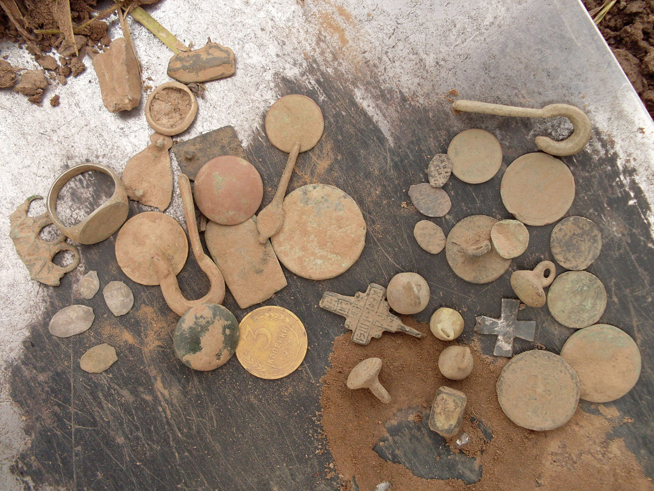 Добрый день. Раз такая пьянка пошла, выложу итог субботней разведки (моя кучка справа за вычетом пары задареной никчёмной сопутки). Отмечу, что под Новгородом копать только начинаю, попытки поездить по урочищам предпринимал, когда жил в Спб, но переплевался. Надеюсь теперь получше и продуктивней изучу свои родные пинаты