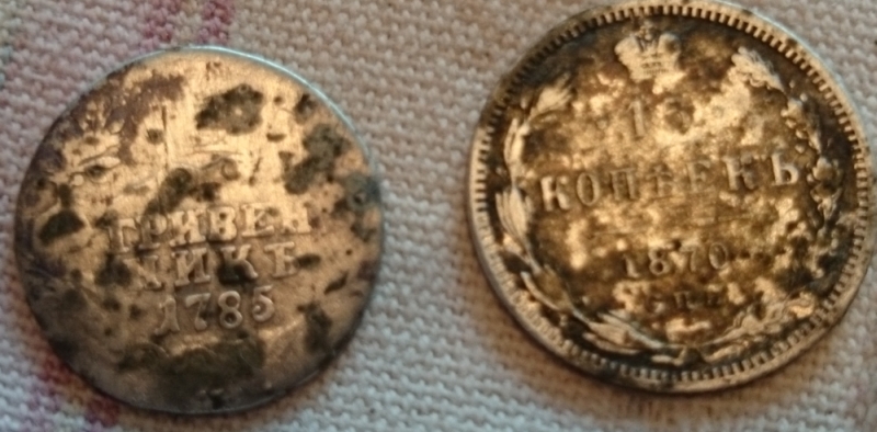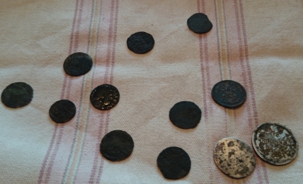 QUOTE(Dikij @ Apr 21 2015, 01:58) Дело было так... ) Учитывая то, что исчезнувшая деревня, показанная мной выше, уже изобиловала зелеными посевами, было принято решение проверить еще одно местечко в 1 км от первого. К нашей радости там засеяли периметр "внутри" поля, остальное только перепахали ) Сразу были замечены следы копарей - незарытые ямы (ну ёптрст ну пни ты кучку земли!) Ездил вместе с племянником, чтобы тот развеялся от ВК и прочих нечистот, да и мне чтоб веселее было. Копали с одним прибором, по очереди. Начинали ходить по диагонали, когда пошли правилные сигналы стали ходить более методично. То что под номером 3 не копали - ОЧЕНЬ много мусора (из находок топорища, тяпки, и т.п.). Тут я убедился, что 705 терка на мусорке оооочень не айс... Ну да ладно, вернулись на участок №1. На участке №1(примерно 40 на 10 метров) мы на двоих нашли 12 монет: боратинки, гривенник 1785г. и 15 коп. 1870г. тоже серебро, полкопейки 1896.. На сл.утро я поехал один, ходил по участку №2. Итог второго выезда 2 боратинки на участке №1; и на участке №2 - 10 грошей 1840 года серебро, 2 гроша 1896г. медь, 3 копейки империи и полкопейки 1896г.. В общем за 2 выезда найдено 18 монет (3 серебра) за 6 часов поисков. Вернусь туда после перепашки осенью . Очень интересен второй выезд, когда монеты были найдены возле самой дороги (вероятно выравнивали местность и сгребали все к краям..? Дорога выше поля примерно на 1 метр, по картам примерно совпадает со старой. Дополнительно: на участке №3 крайне много мусора. Участок №2 - мусора меньше среднего. Участок №1 чистый - т.е. цветной сигнал в 70% оказывался монетой. Ну и скромненькие фото ) Всем удачи! Чудное место. Находки классные, особливо гривенник. Там еще ходить .... и ходить. Примите мои поздравления ЗЫ. А раньше то там что было? Зайдите на сайт Это Место и посмотрите на старых картах, например на Менде. Сообщение отредактировано belov: Apr 21 2015, 20:46 -------------------- Не будите спящего медведя, ему снятся пчелы.