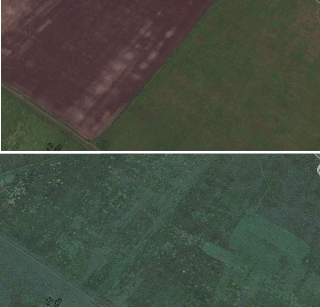 Я связываю это с особенностями стройматериалов на юге России. Хаты в степи строились из самана-блоки из коровье-конского говна, глины и соломы или были турлучными - каркас из всяких веточек прутиков или из камыша обмазывался и набивался внутри глиной. Фундамента не было, пол в них был земляной. И, думаю, белесые пятна на условно черной поверхности пахоты это как раз цвет желтой глины плюс побелка. Вот пример, хутор покинутый в 1960-х годах по южному берегу речки в одну улицу. ![]() Или вот хутор того-же времени По пахоте хорошо виден а по заросшей поверхности едва-едва. ![]() |