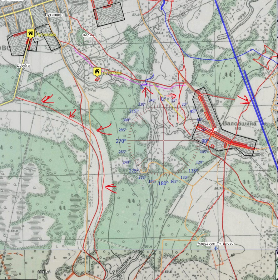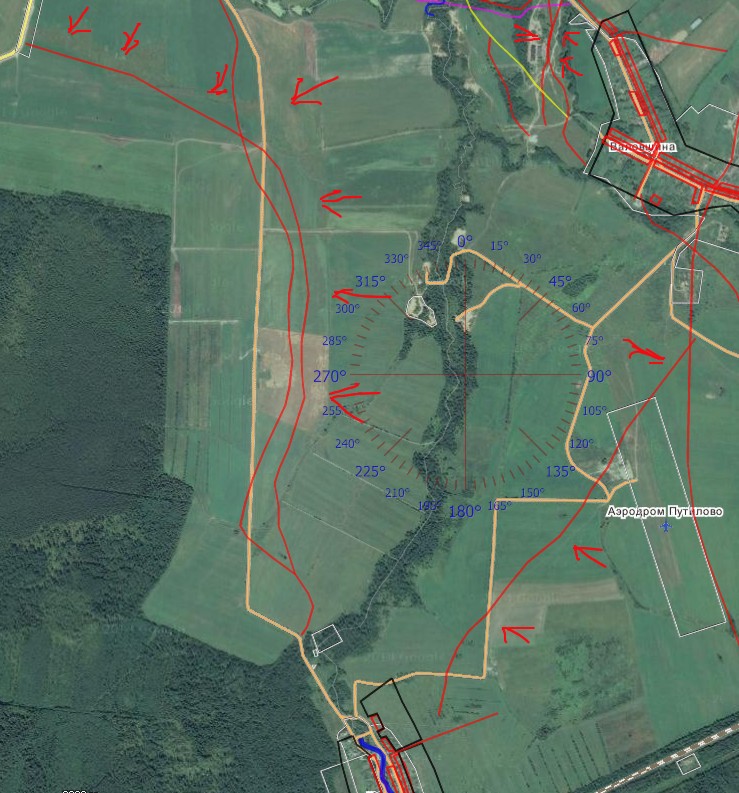 Порядка 50 лет назад была речка маленькая,щас влажный овраг. За речкой кусок старого леса примерно 4 км2. Справа метров 400 река.