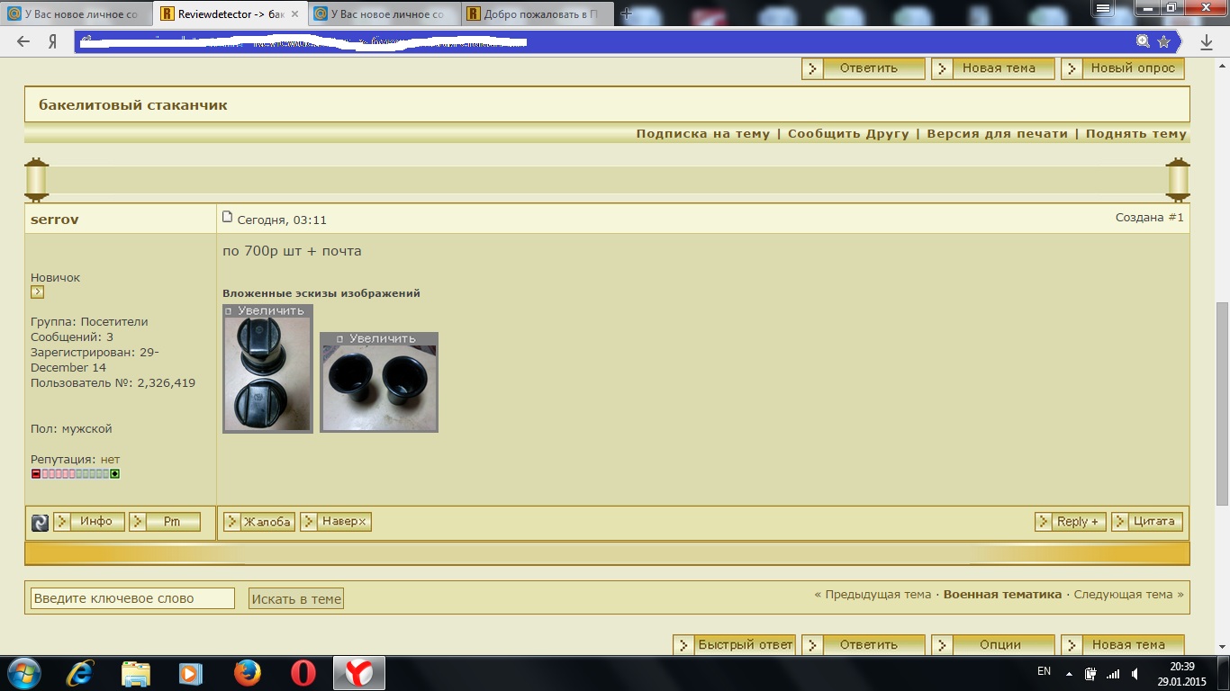 Пользователь ![]() ![]() Группа: Забанены Сообщений: 36 Зарегистрирован: 11-January 15 Из: пермь Пользователь №: 2,327,173 Металлоискатель: x-terra705 Пол: мужской Репутация: 3 кг |