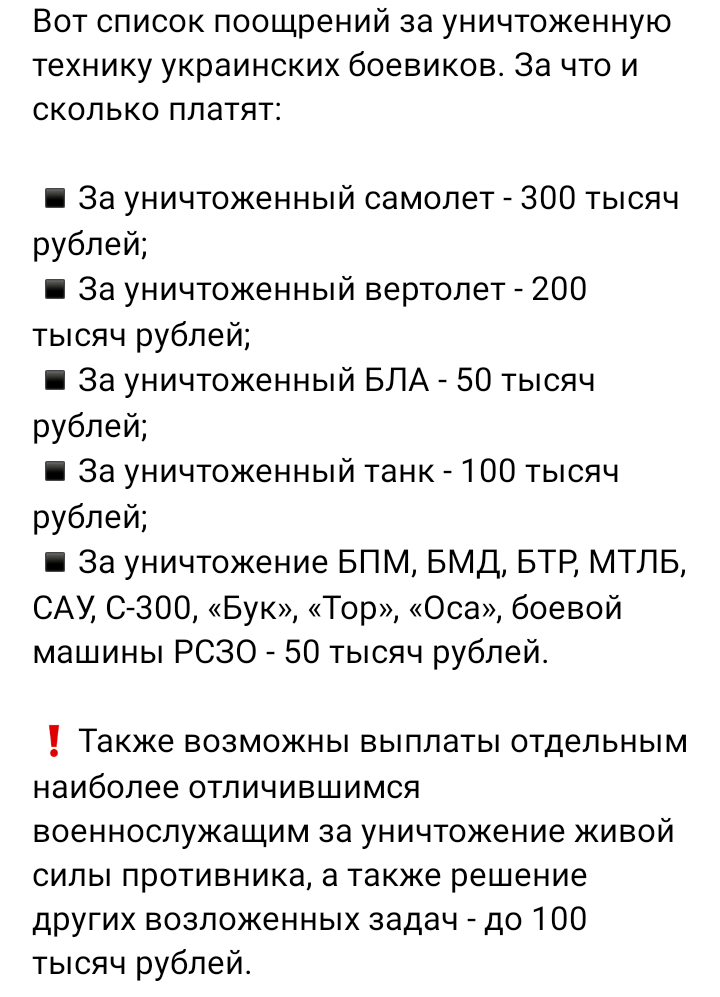 QUOTE(Владелец @ Nov 19 2022, 00:11) Это вроде отсебятина какая то. Вопрос о денежном поощрении только собираются внести в гос. думу на утверждение. По крайней мере закона федерального о денежном вознаграждении еще не принимали. Тут на днях буквально Соловьев прям таки распинался, что надо перенимать положительный опыт В.О.В и премировать бойцов за подбитые танки, БТРы и далее по списку. Только в законе вроде суммы другие предлагали. За хаймарс ( или аналог) 1000 000 рублей, за танк если не танкист - тоже что то около миллиона, для танкистов и летчиков другие суммы. По поводу выплат и не выплат ... другая информация у меня. Военная прокуратура носом землю роет и всех тыловых кто накосячил с выплатами к ногтю прижимают жестоко. Но допускаю вполне, что кидалово тоже может быть. Понимаю в какой стране живем. Я до сих пор в шоке от интервью Стремоусова перед смертью, где он четко сказал про пьянство и мародерство среди ВС РФ, про ФСБшников разграбивших здание Херсонской администрации, отсутствие какого либо контроля за правопорядком в Херсоне. -------------------- менты кАзлы !!!