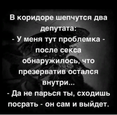 QUOTE(Солод @ May 23 2023, 22:32) Правильно, политика должна быть выше экономики, а пока у нас наоборот Володин будет везти в Россию пальмовое масло, он ведь тоже бизнесмен и не из совка. В первую очередь защита своих рынков,интересов страны, а не серебренники в своём кармане! так ГоуВест чуть ранее списки предпложительных геев у нас в верхних эшелонах накидал, можно верить, можно нет... там и Володин фигурирует, хотя конечно свечку скорее всего никто не держал... так... кукушка накуковала... может он не для еды пальмовое масло завозит то ? а в это самое, только с одним "Н" QUOTE(GoWest @ May 23 2023, 22:43) В анналы! Сообщение отредактировано Barsoff: May 23 2023, 23:18 -------------------- Хамство, неуважение к другим участникам форума, переход на личности повлекут отстранение участника.