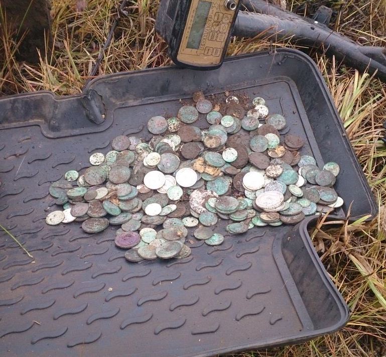 Общая масса лежала или ядро около 300 монет лежали вместе,а вот другие в разброс примерно 2х2м.Все равно как прятались в печке и вместе с ней рассыпались.Но до этого монетки сверху попадались,что явно было видно по количеству ямок.
