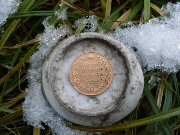 шурфлю давно,но не все подряд.нашли домик,поповский.ни кому не мешаем.деревня почти умерла.решили внутри пошурфить.в первый день монет 30 подняли.место видно старое.несколько чешуек медных,два пятака,один из них 1764-м.м.в приятном сохране.решили еще раз размяться,и с первой же лопаты у меня выскакивает желтопуз.я стал слеповат,беру,и со словами,достали советы,кидаю напарнице.она поднимает,протирает и начинает как скорая помощь кричать-это золотой,золотой.повосхищались,перекусили,угостили деда.жалко что не 1827 цена до 5 000 000