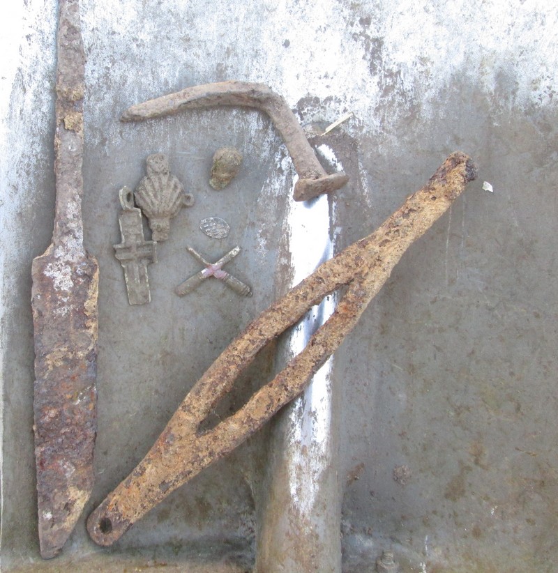 Результат- ![]() ![]() ![]() ![]() ![]() Толщина до глины всего штык, много тонкой, белой керамики, не очень много кирпича. Советская монета и пара алюминевых пробок вылезли в самом конце - надо продолжать в другую сторону. Пока не нашел печную кучу (странно) и слой какойто тонкий и плавающий по толщине. А деревня есть на ПГМ, обычно слой больше. Попалась в единственном числе половинка керамической плитки с рельефным зеленым узором, размером с пачку сигарет. Золоченую пуговицу не смог определить. Правильно понимаю, что в доме обычного крестьянина такого комплекса встречаться не должно? |
