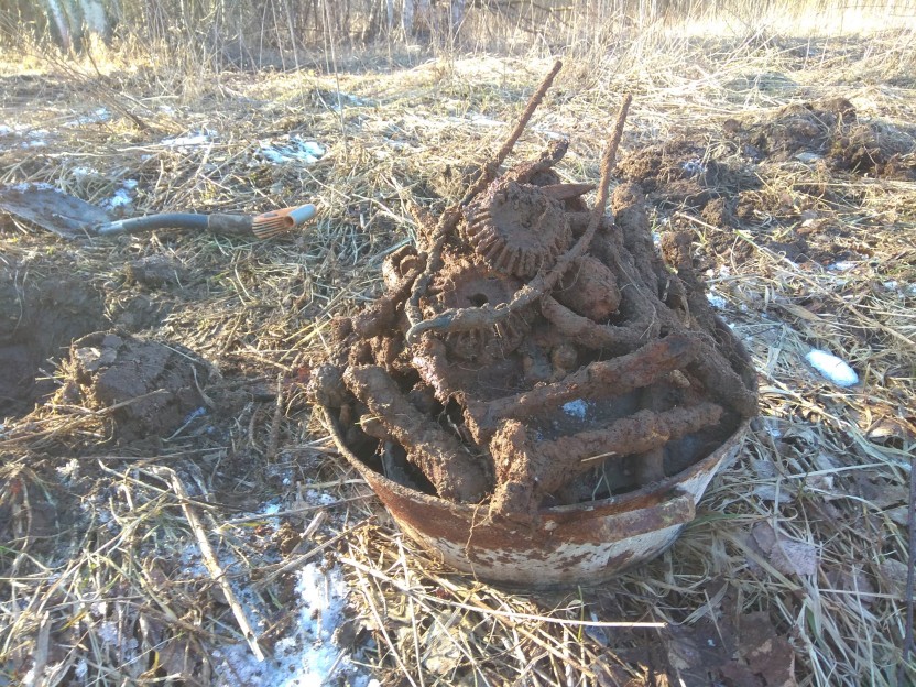 Через пару дней вернулся в надежде найти крышку, убрал сверху ветки и прочий хлам. Помахал "от колена", понимая, что сигнал от крышки должен быть уверенным но, к сожалению такового не оказалось. Начал копать, благо слой был не большой 1.5-2 штыка, фундамент был просто нашпигован всяким металлоломом, неожиданно появилось две латунные трубы, как с начало показалось самоварные, оказалось другая тема.