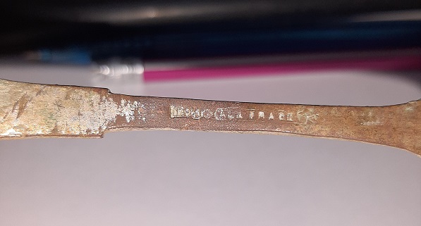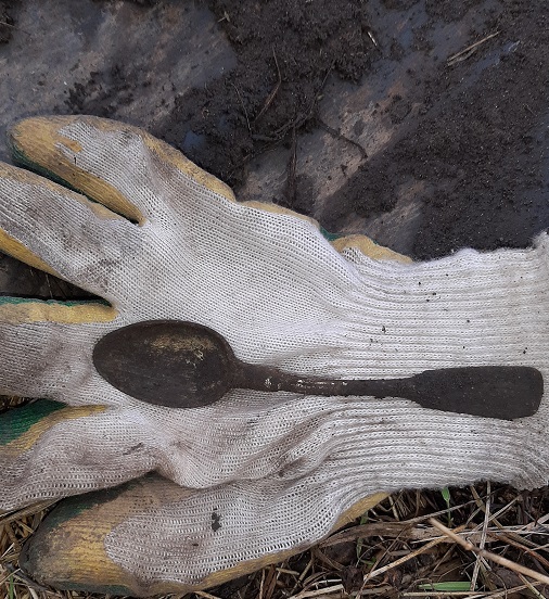 Начал ходить вокруг. Выскочила запчасть от керосиновой лампы, потом дно от чугунка, кусок полотна ножовки. Метрах в 6 от ям была прямоугольная площадка 2х3 метра примерно. Проскочил сигнал монетный на Венике, копаю-вываливается ложка десертная посеребренная. Как потом по клейму определил - производства Фраже.