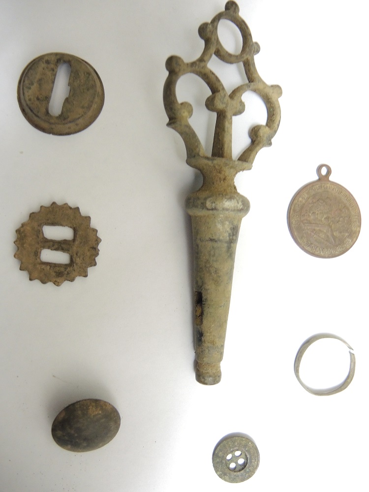Добрый вечер,коллеги.Спасибо за пожелания!!!Вот отчет с сегодняшнего фундамента.На фото деталь от ножен шашки,1 копейка 1909 года,денга 1740 года,2 кольца серебряных обручальных и 3 копейки 1843 года ЕМ.Все еще е чищеное.Свежак