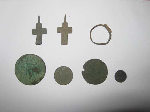 На выходных начал вскрывать свой первый фундамент... Погодка конечно не фонтан... поэтому в первый день удалось покопать часа 4 (с учетом покоса и разведки) и во второй день часа 4... потом зарядил дождь и пришлось сваливать... Теперь о впечатлениях... ожидал худшего... если не спешить и вдумчиво махать лопатой, то копать можно... углубился примерно на 70см до песка... общей площадью раскопа примерно 4 квадрата... железо бубнит, но сносно... цветмет выловить можно... камни... кости... зола... в итоге... колечко... 2 крестика... ВРПшка 1721... копейка Елизаветы(утертая)... двуха Павла 1801 и копейка А2 1880 года... вот такой результат... думаю надо расширяться... и долбить... долбить... долбить... Вложенные эскизы изображений -------------------- ...