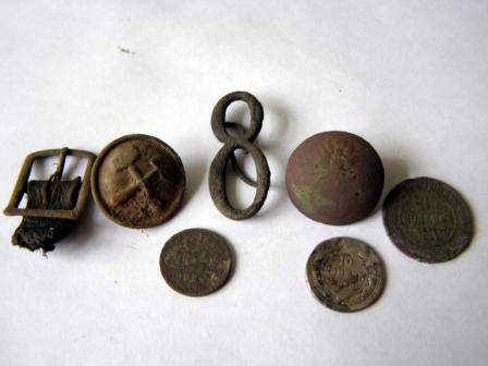 Набрел сегодня на открытый фунд... Видимо люди там долгое время над ним работали, глубина по пояс. По краям осколки керамики. Решил прозвонить отвалы. Вылезла 1/2 копейки 1899 г, пуговица Горного ведомства с перекрещенными молотами, ременная пряжка с кусочком ремня а чуть поодаль от этого места, цифра 8 - с погон.