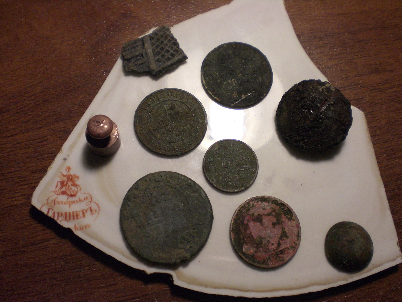 1-осколок фарфоровой тарелки фабрики Гарднера-взял из за клейма)))) такие тарелки производились с 1850 по 1870 годы... 2. Весовая гирька 5 грамм...сверху выбито 5г снизу серп и молот и клеймо 296....искал в интернете-ничего не нашел(((( |