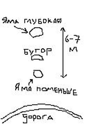 Одна монетка найдена на бугре, между бугром и глубокой ямой (глубина более метра) найдены ещё монетка, пуговица и ещё какие-то мелочи. Монеты и пуговица 19 века. В яме поменьше (глубина сантиметров 50-60) только пробки времён советов. Уважаемые специалисты,откуда и куда стоит начать шурфить и где вероятнее всего находился вход? |