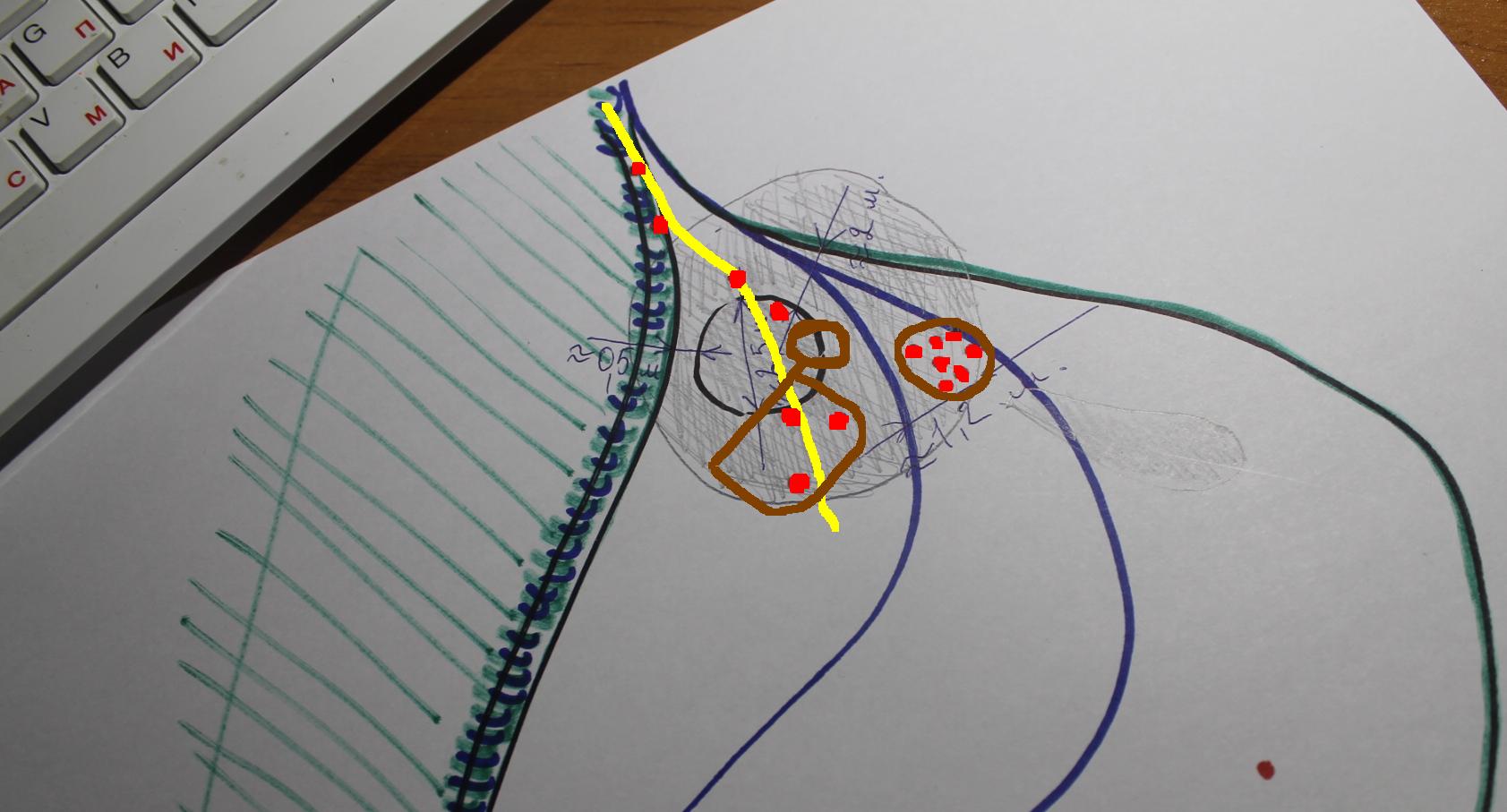 Коллеги,хотелось бы немного обсудить шурфовку недольшой визуальной постройки,не буду утверждать,что это домовая яма,возможно сарай,но не судь,вобщем дело обстоит так: Синими полосами отмечены границы поля,которые когда то были границами этого же поля так сказать,тоесть мыс,котрый отмечен черно-зелёным цветом пахался на примерно половину,а потом уже не пахался много времени.Идём далее: Красными точками отмечены найденные мной монетки(дирхемы) .Если смотреть на схему,то где отмечена яма и за её пределами ,видно,что монеты выстроились в рядок,который уходит по жёлтой линии.Я пробовал шурфить где отмечено коричневым,но кроме керамики,которая отмечена простым карандашом(заштрихована)ничего нет.Между синими линиями(старые границы поля)найдена кучка монеток.........Вопрос,как мне ещё пробовать шурфить,если конечно есть смысл,и в каком направлении лучше начать,чтобы не лопатить весь мыс......... Вложенные эскизы изображений -------------------- Ой ты, Русь, моя родина кроткая !!!