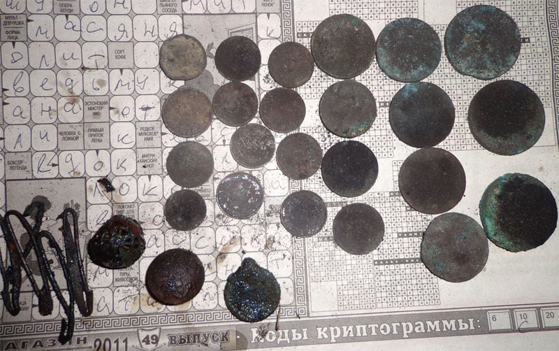 Только что вернулся с копа, был выбран перспективный фунд ( около 15 монет поверху и много битого фарфора, стекла и т.д.). В результате вскрытия участка 2х2 м на 4 штыка, не было найдено ни одной монеты, попадалось много стекла, костей, цветная жбонь типа фольги и тонкой меди... В общем настроение упало сильно, надежда была хотя бы на пригоршню советов, а вышло по нулям. Неужто все поверху лежало.
