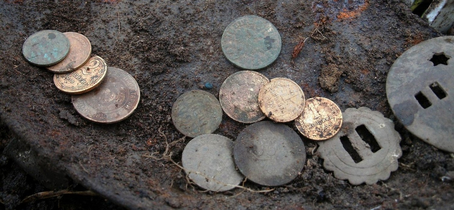 Три года фунды выносим, самая старая монета - копейка Петровская...