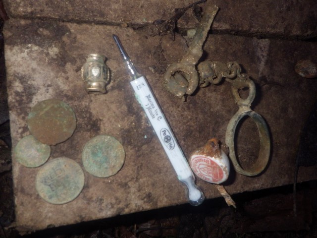 Ключ от замка, ножны от точильного камня, бутыльки. ![]() Монетки 1860-х две Франция,две Пруссия, пробка от пивной бутылки, конина латунная, еще какая-то подвеска из цветного металла позолоченная с якорем, сердцем и крестом- талисман-вера, надежда, любовь, градусник -был в латунном футляре, который после извлечения оного развалился, градусник полностью функционирует, без утрат. ![]() Под конец дня бутылек расписной попался. |