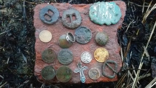 По сегодняшнему выезду оказалось не всё так радужно, как я описал. То, что я в прошлый раз посчитал контуром фундамента, оказалось отвалом лопаты бульдозера, которым заровняли фундамент. Поэтому чётких границ, как я описал, эти отвалы не представляли. Вырыл пару ям, в стенки фунда не попал, в ямах попадались куски кирпича, камни, керамика. На железных сигналах выкопал запчасти от печки. В общем пришлось довольствоваться верховым поиском по развороченному фунду. Некоторые монетки попадались прямо у поверхности, видимо вывернутые с фунда (копейка серебром торчала рёбрышком из земли) В общем кое-чего вылезло, не густо, но и не пусто, а для наших краёв в общем то очень даже и ничего)) В следующий раз беру с собой лодку, поеду на противоположный берег, вот там пара конкретных фундов имеется, и расположение у них зеркальное этому, так же дороги проходят и та же река, это я уж точно помню Сообщение отредактировано SergSpb: Apr 1 2015, 23:37 Вложенные эскизы изображений |