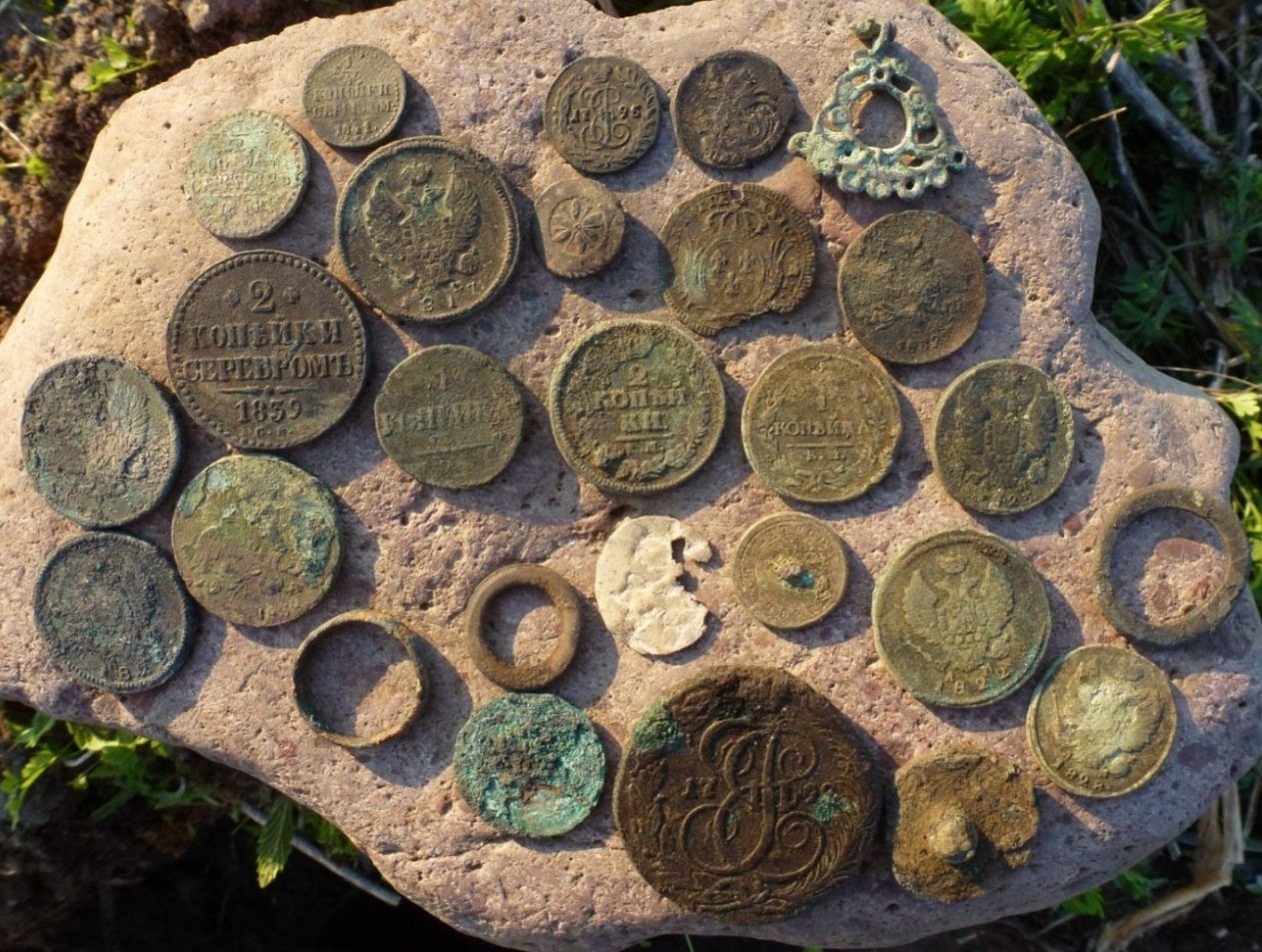 Итог сегодняшних поисков, порадовали полушки КМ за 1795 и 1787 года, пятак КМ-овский Екатерины II за 1792 год. Разочаровала серьга - пока мыл в луже с талой водой - камушек из центрального отверстия выпал - усики посгнили, а вот сама серьга возможно из серебра.