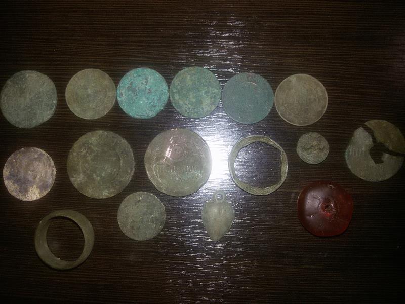 На следующий день я копал один, выбрал холмик без домовой ямы, не был уверен что это фунд пока не пошли кирпичи, заложил шурф от угла к углу, попались копейки 1911 и 1912годов, пуговицы, гильза, подвеска в виде сердца, огромная бусина толщиной с палец из янтаря, ближе к печи поднял одну за другой копейки 3шт все одного года 1901 думал что закладуха но нет...кстати сохранность монет на глубине оказалось никакущей, самое ценное что нашёл 15коп 1860г это моё первое серебро Вложенные эскизы изображений -------------------- Если выйграл лот, сообщите пожалуйста
