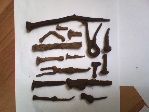 Приветствую! Тоже сейчас на фундаменте - бывшей однодворки 18 века, в лесу. Впервые. Земля мягкая как пух, но сеть корней затрудняет работу. По находкам понимаю, что здание было разрушено пушечными ядрами и картечью. Разнесло все по периметру.Деревянные постройки сгорели. Под дерном слой из смеси земли и пепла. Из находок - много битой керамики, кости, стекло, кованые гвозди в изобилии, обломки подков и ножей, кусок соли, обломки игрушек - свистулек. Из монет только 6 штук попалось- полушки 1735 г - 1736г и деньга 1849 г. - найдены в разных местах. Сохран монет хороший - пока отмокают. Сложно определить где именно и как стоял дом. Фундамент как таковой отсутствует. Скорее всего была кладка из булыжников под бревнами / часто попадаются. Кирпич от печи хрупкий и редко попадается где то снизу крепкий обломок кирпича. Шурф на глубину два и три штыка, а глубже лопата упирается в плотный белый песок и никаких сигналов. В принципе место интересное, хоть и с монетами туго. Но не оставляет мысль что где то рядом есть еще и чугунок т.к. попались только три маленьких обломка от верхнего края чугунка. Мучает вопрос - куда же его могло срекошетить. А вдруг он еще и с "медом"