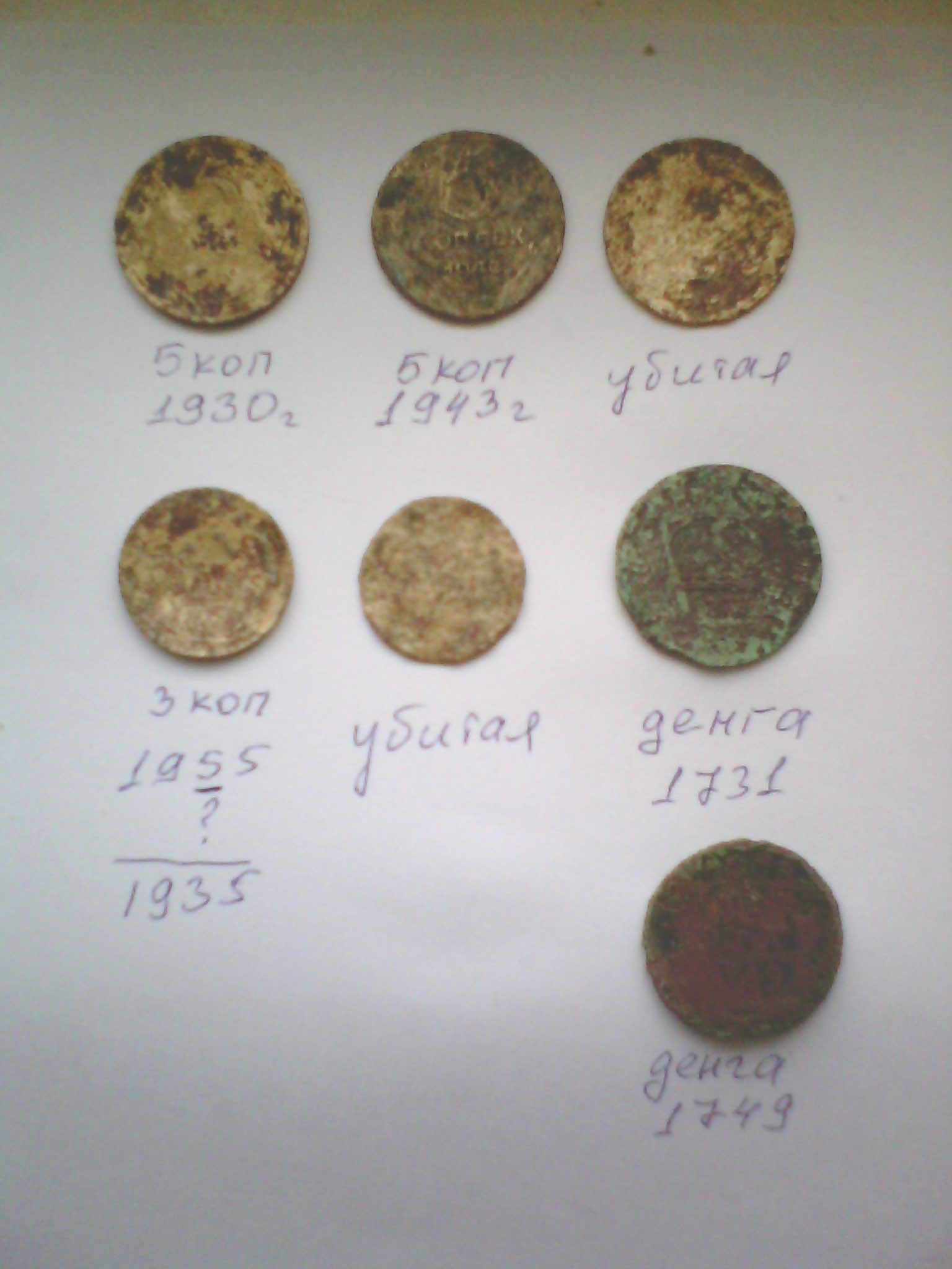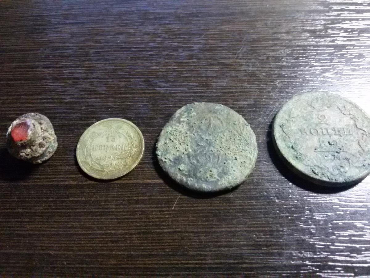 Сегодня разведка нового места. По старым картам не понятно было, или затерто или квадратный пунктир не ясный. На спутнике лесистая часть как бы взъерошена на подобе предыдущего места. Решаюсь потратить время и проверить. Как бы то ни было, но ноги привели куда надо как оказалось. На квадрате примерно 15 х 15 попались 7 убитых монет (на фото). Причем обе денги по середине грунтовой дороги. Сразу вскрылся битый кирпич с опалом. Пока не ясно, или потеряшки как и советы или именно здесь была однодворка раскатанная под дорогу. Думаю далековато было бы вести в глушь битый кирпич укреплять не большой участок поверхности лесной дороги. Площадь метр на метр на глубину штыка не дал ни каких сигналов. Совсем рядом еще пара увядших дорог. Часто выскакивает пуля или гильза или нечто свинцовое. Какой то перекресток странный. Похоже когда то живенько тут было. Дальше уже и день закончился и силы, да и выбираться 3 км пешим из глуши далековато. Разведка как то так прошла.