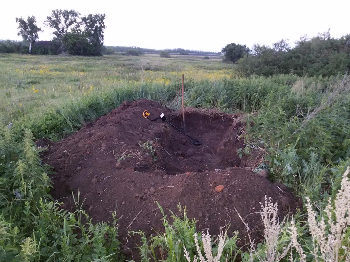 расскажу как покопал на выходных, решил попробывать раскопать новый фундамент стоящий по соседству от первого моего раскопанного фунда , было небольшое возвышение заросшее крапивой, заложил шурф от правого угла если смотреть со стороны улицы, ничего не попадалось, ресширил траншею пошли красные кирпичи и осколки посуды решил что сначала копал завалинку, за 3 часа снял грунт на глубину 4 штыка, но находок вообще не было, кроме одной одной монеты копейки Елизаветы, устав махать лопатой перешёл на старый фундамент, который раскапываю уже четвёртые выходные, увидел в нём следы конкурентов, пытались немного копать но бросили