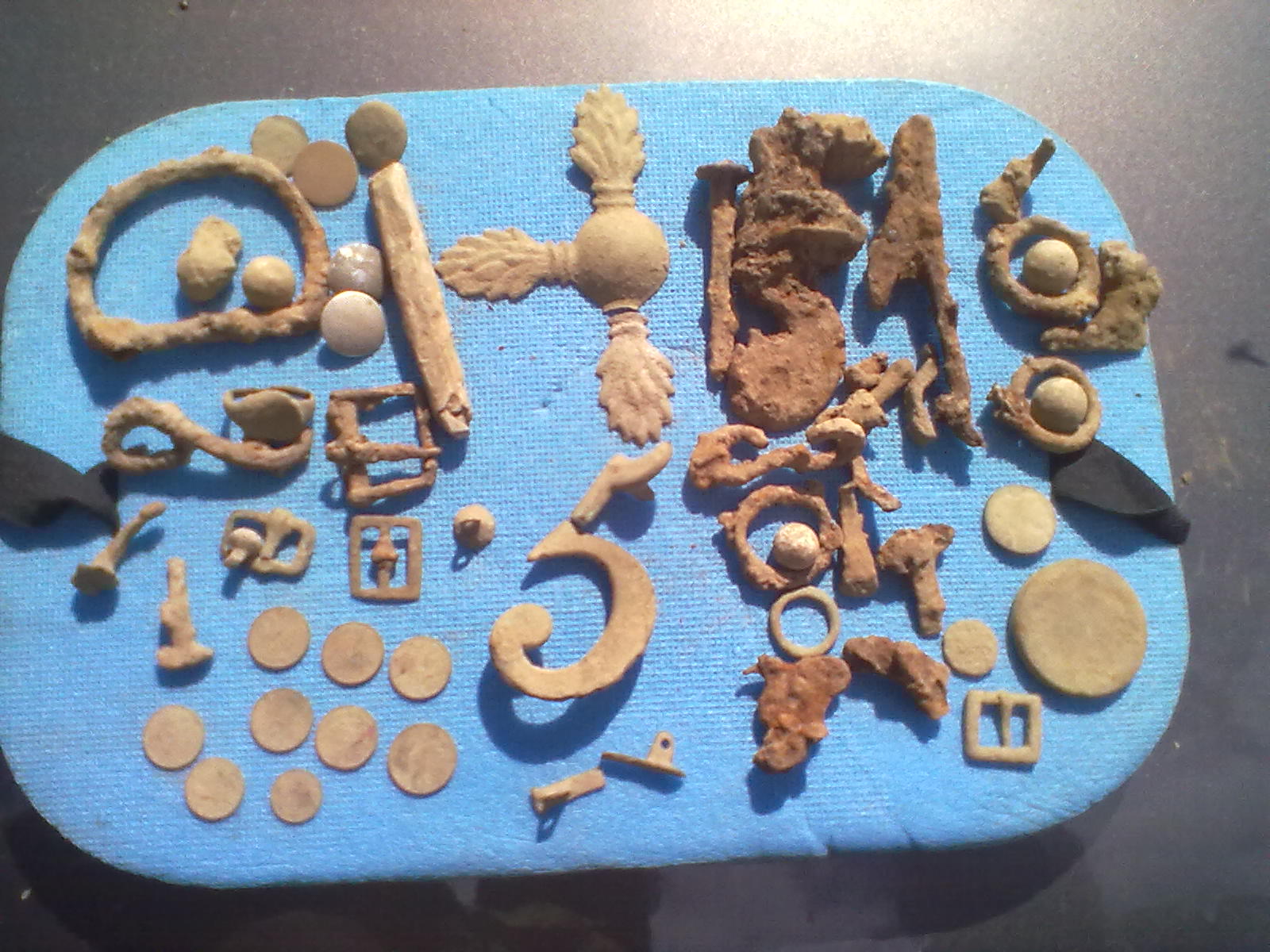 QUOTE(geha @ Jan 31 2013, 16:20) Всем привет!Тема не моя,но любопытство разбирает,предметы на фото лежали в одной ямке был виден черный след от ремня(ткань может кожа).От чего это. Было долгое обсуждение. Это две накладочки с мундира вюртембергского лёгкого кавалериста. Ими пристёгивались отвороты фалд за уголки. Находят регулярно. И, вероятно, пряжка с панталера. Возможно, этот кавалерист упал на спину и там помре. Может и вмёрз. Так как вроде остался металл только со спины. Остальное видно собрали. |