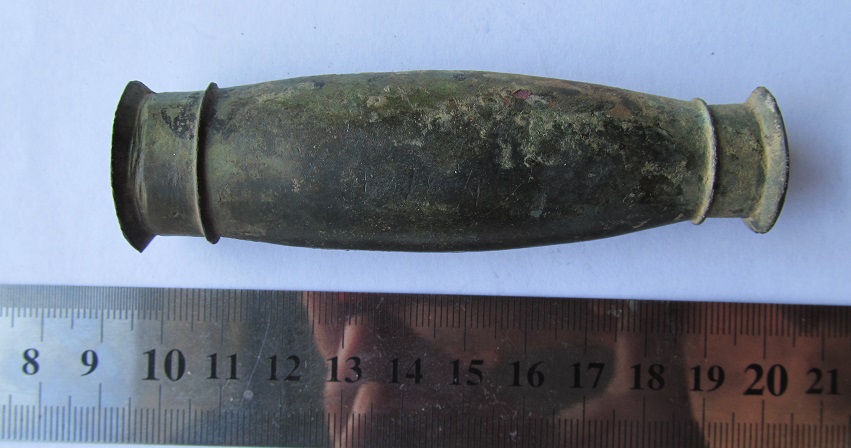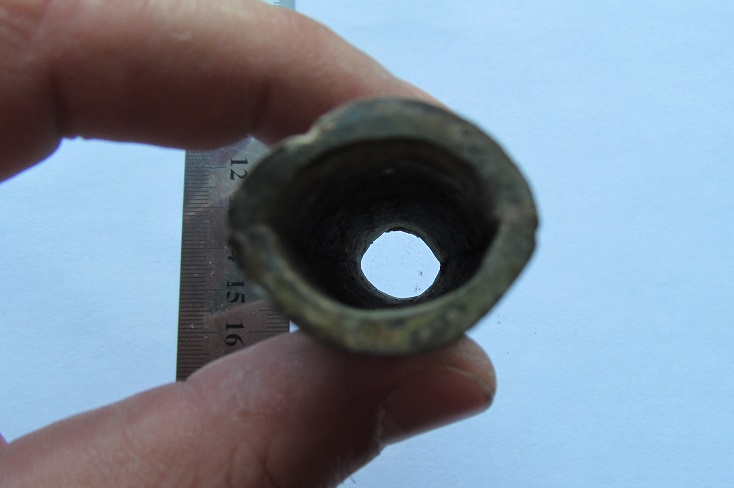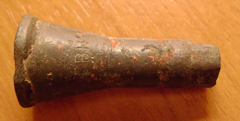 Да, ещё вот такой предмет поднял. Думаю мундштук от трубы. Под увеличением видны вроде остатки красной краски. Также видно клейма: ГВН29 (или вместо девятки 0), далее непонятное клеймо, затем IV и 91. Длина 4 см. Вложенные эскизы изображений -------------------- - Я интересуюсь знать... ("Ликвидация")