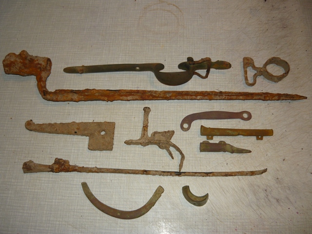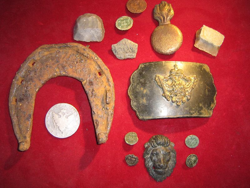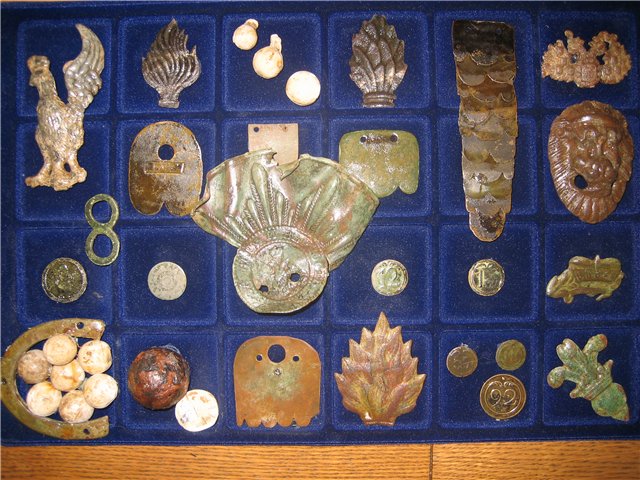 QUOTE(колбаса @ Oct 16 2010, 18:07) очень интересно неделю назад поднял точно такую под звенигородом! только у меня она явно пробитая пулей в левый глаз вход ровный круглый выход развороченный.я подумал что это накладка на входной замок а где отверстия было кольцо.на одежде такое не поносишь тяжелая.а вы территориально где подняли если не секрет? Вот и мне интересно, но я больше склоняюсь к мнению, что это конина, имеется же крепление. Место находки примерно в 5 км от Троицка. Вот нашел в инете фото похожих предметов среди других вещей по 1812 году Сообщение отредактировано Borisswd: Oct 16 2010, 19:04 Вложенные эскизы изображений -------------------- Куплю бронзовые замочки "лошадки" 14-15 вв. (половинки и целые) . Предложения в личку.