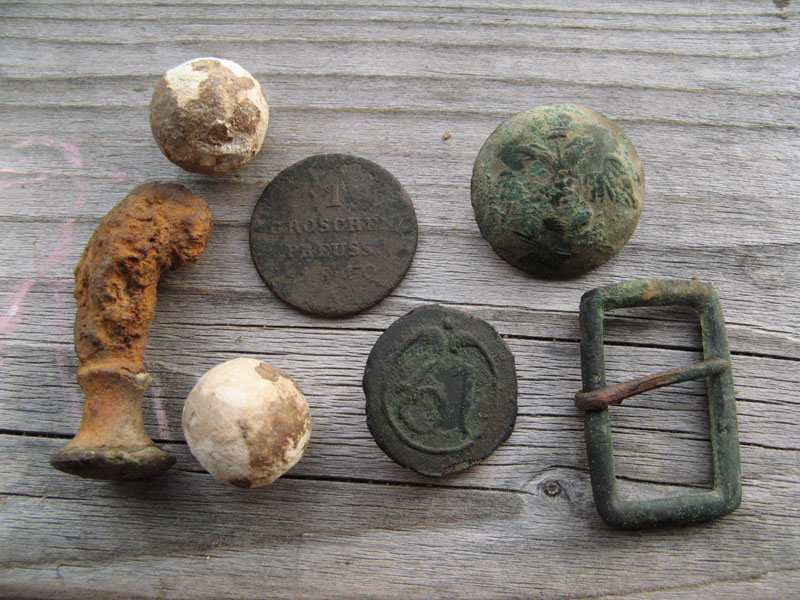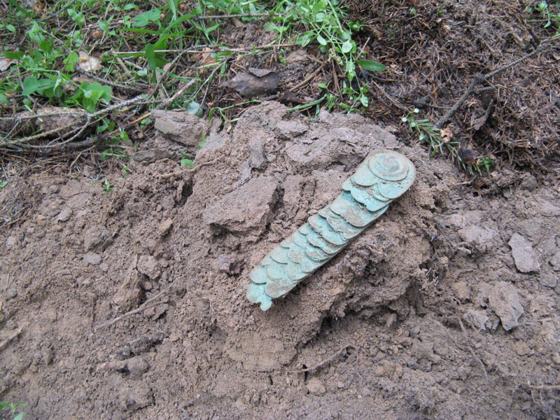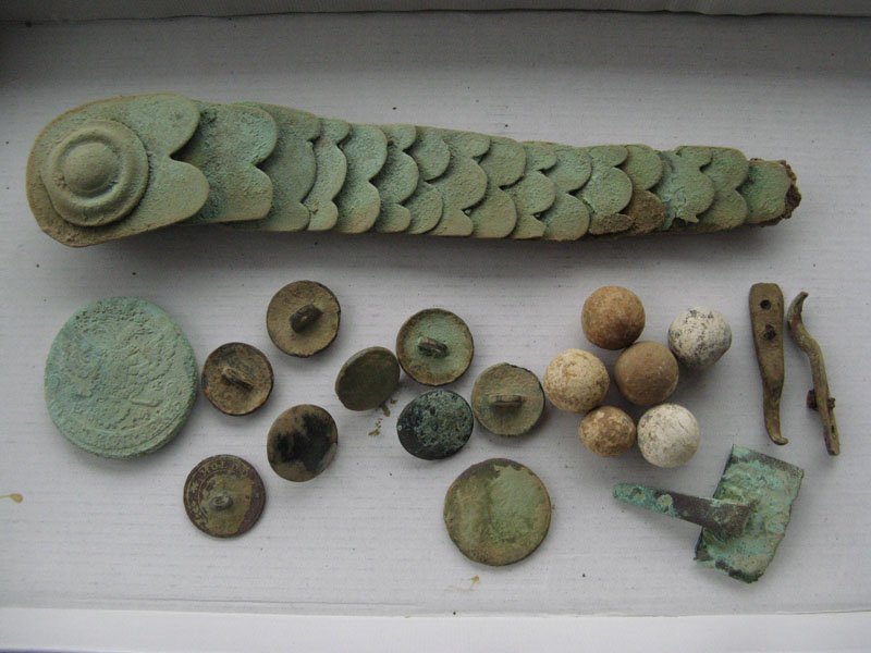 Как всегда неотемлемые атрибуты это пули и Екатерининский пятак. Три находки справа на фото незнаю относятся к 12 году или нет, были на этом же месте, подскажите кто знает что это за крючочки . И под конец появилась она...киверная чешуя, сохранились даже остатки ремешка. На фото в земле еще не вся, на общем фото полностью. Вложенные эскизы изображений -------------------- В кого суют, того и имеют.