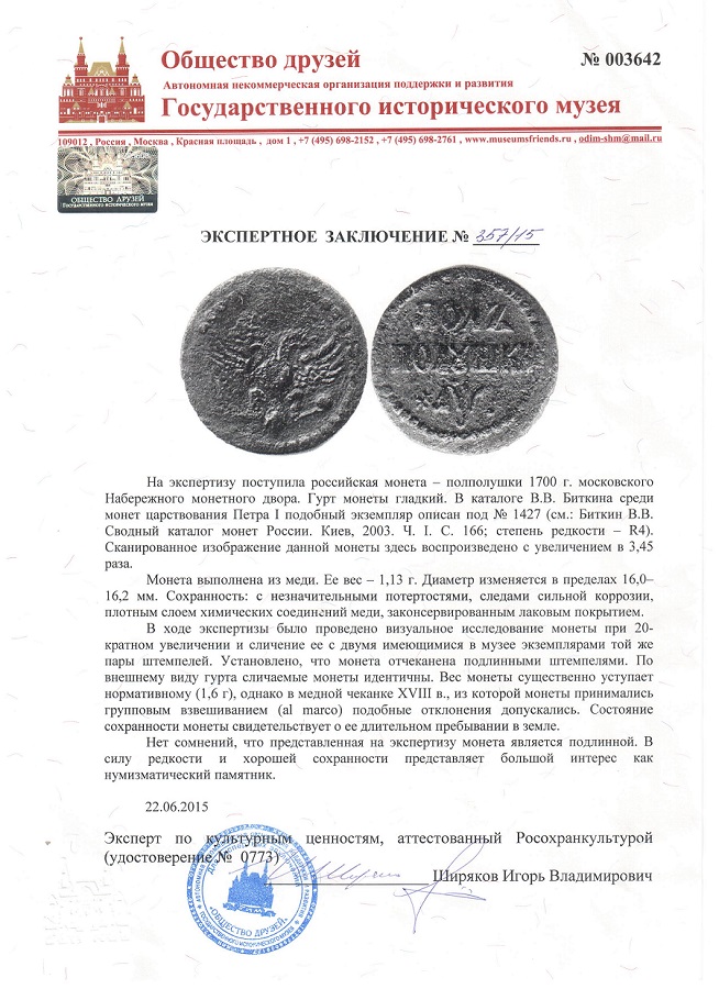 Вчера получил экспертное заключение в ГИМе. Очередное доказательство, что хороший мастер, монету не испортит и своей исторической ценности монета не теряет. |