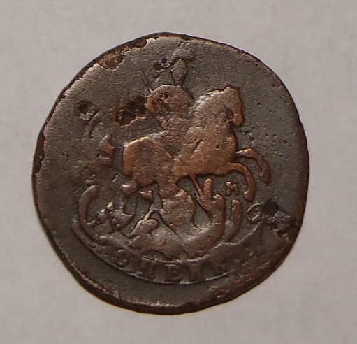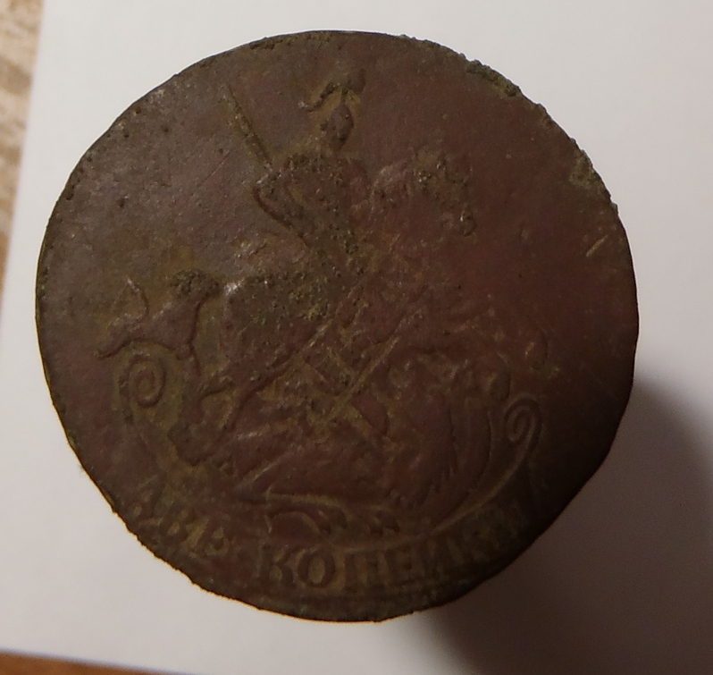Прошу определить тип перечекана данной монеты. 2 коп.1758 г. 19,97 грамм. диаметр 30-32 мм. На гурте "Екатеринбург". Примерная цена?