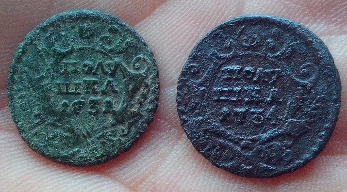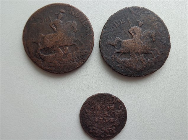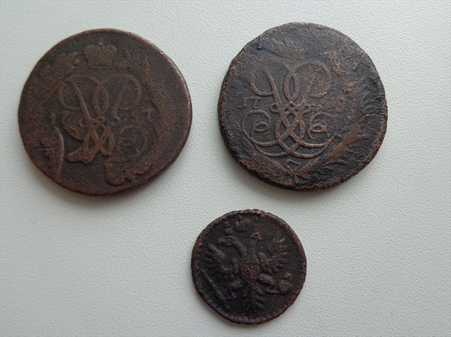 1. 2 коп 1757г - начало от крестового пятака пошло(на реверсе видны следы), потом облачко 1756г (дату над головой коня видно). наверное так.