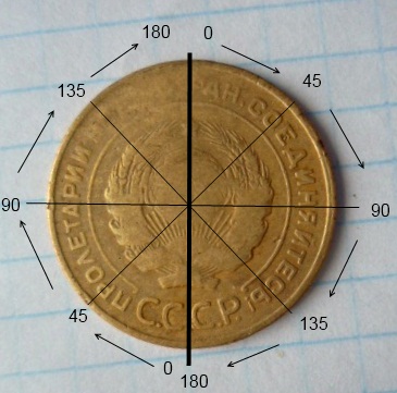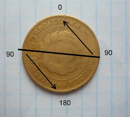 Посмотрим на вашу монету, если применить данную методику, получается, что отклонение чуть больше 90 градусов.