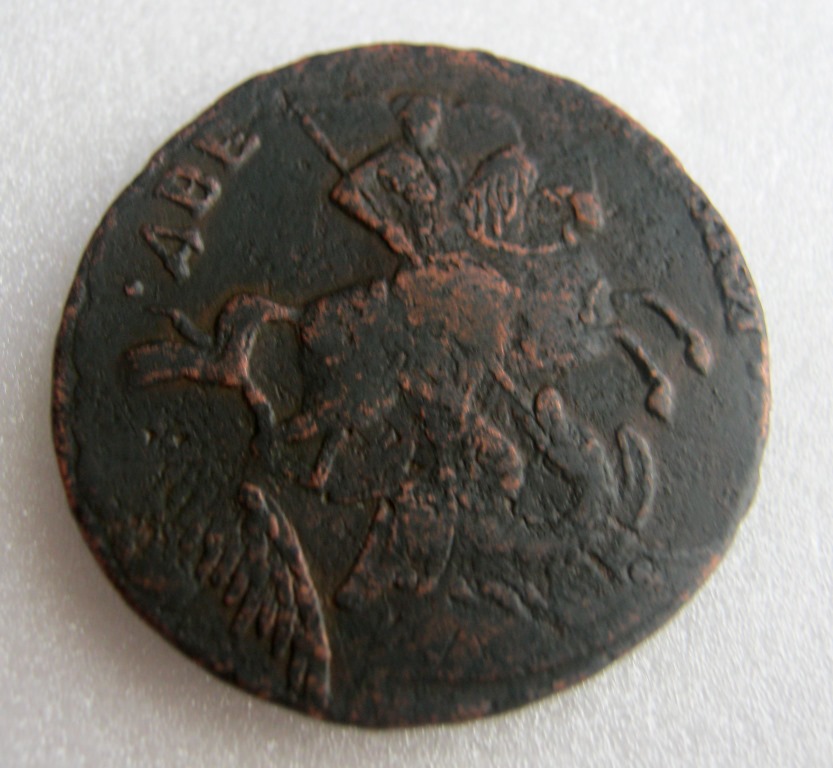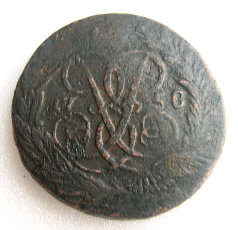 Добрый день! Подскажите по монете 2 коп. 1758 года. С какой монеты перечекан? Гурт: надпись, не могу разобрать (несколько букв) Будет ли интерес к монете на аукционе?